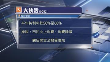 公司發通告指,估計截至9月底止的半年純利將同比下降50%至60%,主要受到本港居民北上消費、內地及香港消費降級,關閉店舖造成的費用,以及減值撥備增加拖累,大快活去年上半年錄得約3630萬元盈利。
