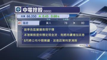 【Now財經台】滙豐證券認為,中電控股(00002)短期前景仍然樂觀,加上增加派息憧憬,維持「買入」評級,目標價則由78元上調至80元。