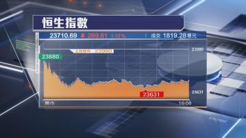 大市今日(18日)低開120點,午後最多跌348點,低見23631點,尾市跌幅略為收窄,收市跌269點,收報23710點,失守20天線。大市全日成交縮減至逾1819億元。