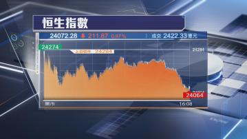 市場關注美國聯儲局減息取態及美國跟貿易伙伴的談判,大市今日(30日)低開9點後,跌幅逐步擴大,尾市最多跌219點,低見24064點,收市報24072點,跌211點,連跌第3個交易日。大市全日成交縮減至逾2422億元。
