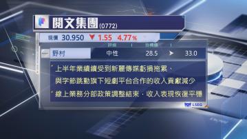 【Now財經台】野村上調閱文集團(00772)目標價逾15%,由28.5元調高至33元,維持「中性」評級。