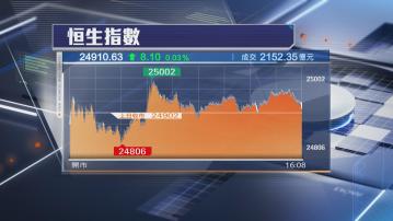 【Now財經台】本港股市缺乏方向,恒生指數於25000關遇阻,但仍連升3日。