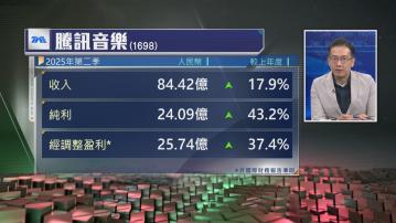 【Now財經台】騰訊音樂(01698)第二季經調整盈利增長37.4%,好過預期。